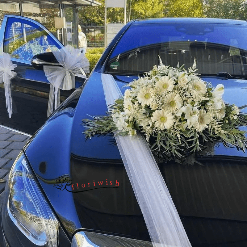 - 1 White Flower Bouquet in front of the Car Bonnet